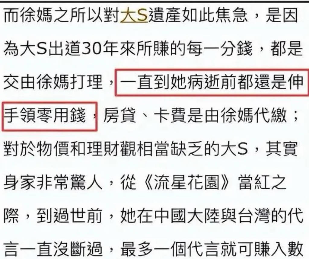 大S出年来所赚的每一分钱,都是交给S妈打理的,一直到她病逝前都在伸手领零用钱。大概这也是为什么,黄春梅会对大S遗产如此焦急的原因吧。