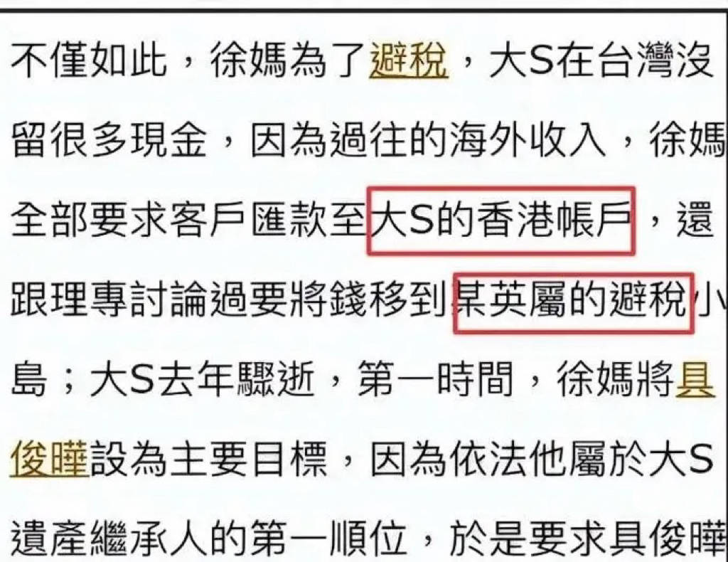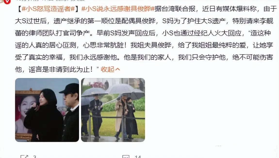 可这些都是传言,没有切实的证据。目前的情况就是大S遗产还没有分割完毕,具俊晔、S家、汪家,像是三足鼎立的局面。